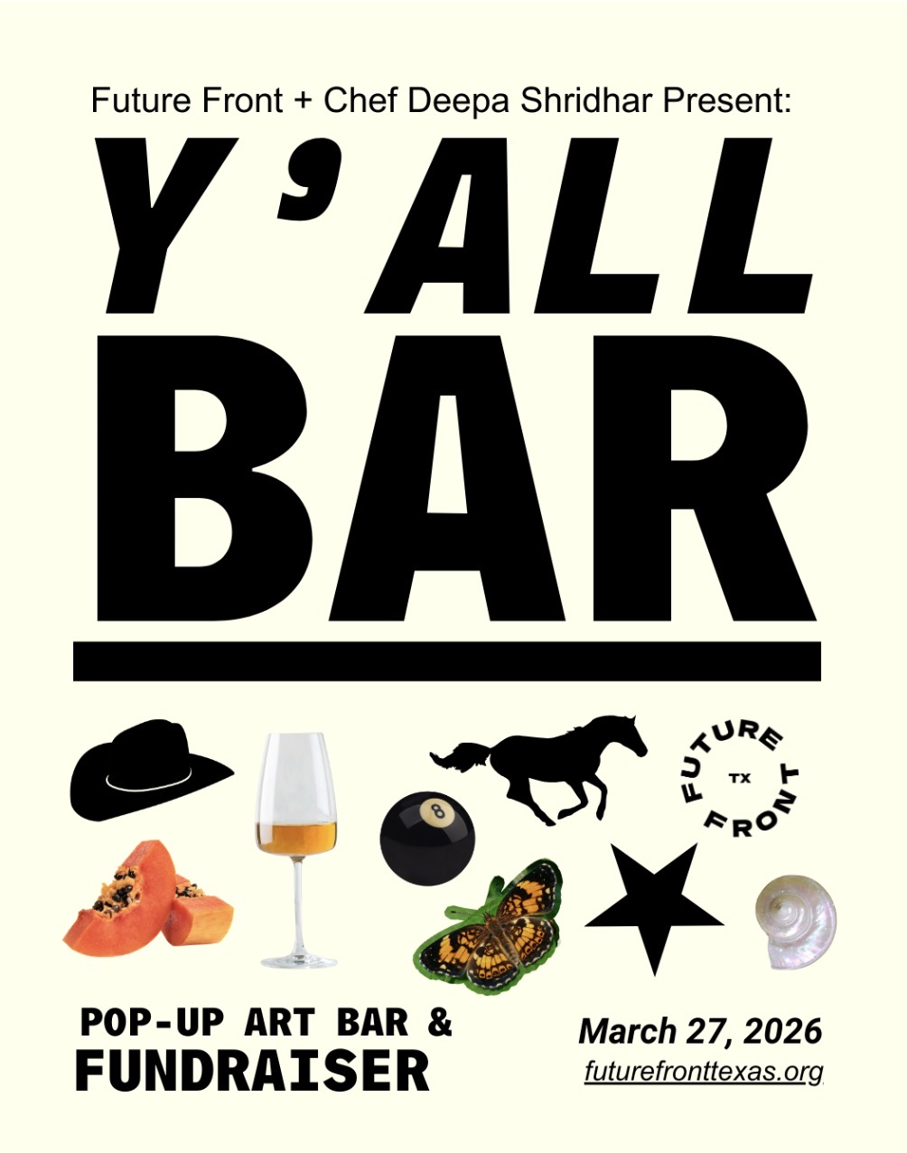 Welcome to Y’all Bar. Inspired by Future Front’s annual Y’ALL DINNER, your favorite art bar pop-up is back. Play with clay and enjoy a chef-curated menu of South-Indian-Texan cocktails and kolaches—all fundraising for Future Front. As a fundraiser, all proceeds benefit Future Front’s arts and culture programming in Austin’s changing landscape.